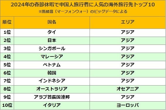 馬蜂窩のビッグデータによると、2024年の春節連休で最も中国人に人気のあった海外旅行先はタイで、次に日本がランクインしていました。2024年から始まったタイと中国の30日内のビザ相互免除による影響でタイは人気の旅行先となっています。日本と中国は2020年3月まではビザが免除されていましたが、コロナ禍をきっかけに免除措置が停止。現在も出入国にはビザが必要となっていることも日本が2位になっている要因の1つです。