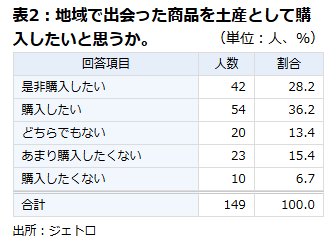 旅先のレストラン・カフェ・体験施設・ローカルショップは、実際に商品があり、試食・試飲・体験して購買意欲が高まるタイミングです。JETROの調査でも、「地域で出会った商品を土産として購入したいか」の質問に「ぜひ購入したい」が28.2%、「購入したい」が36.2%と、7割近くの外国人が購入したいと回答していました。
